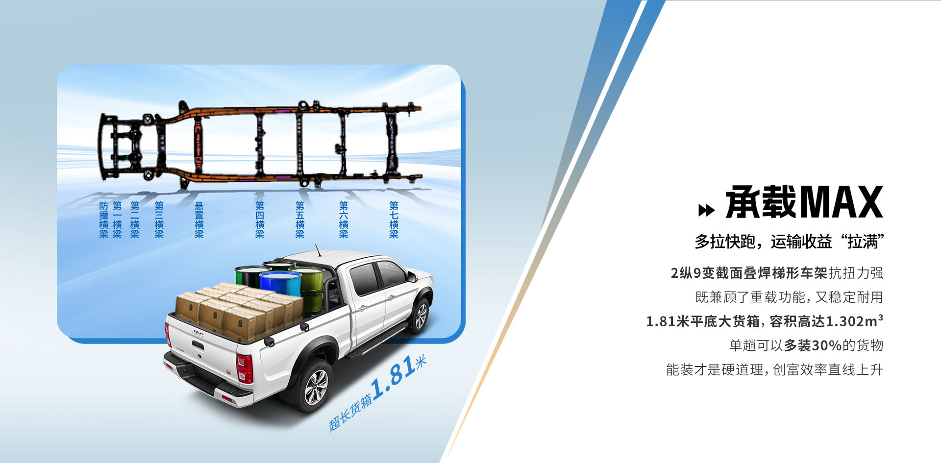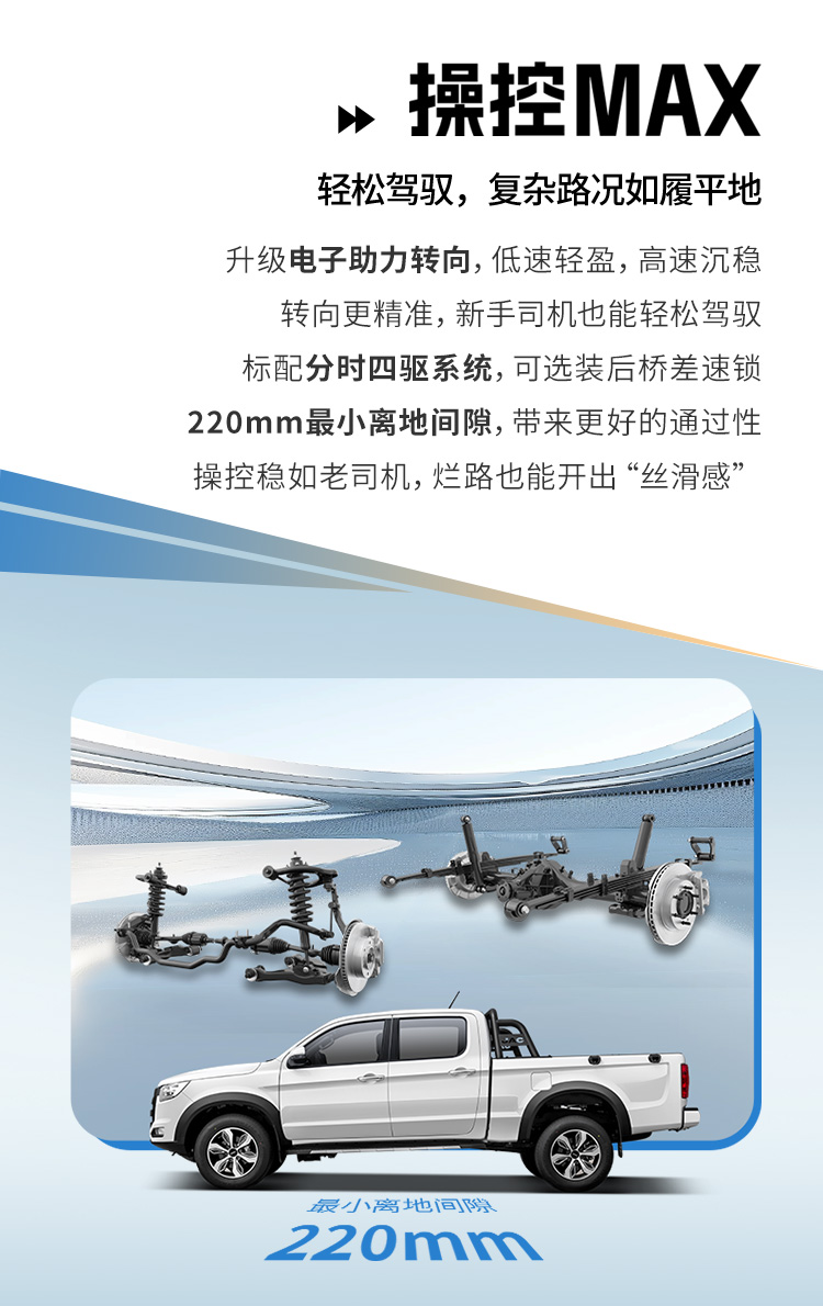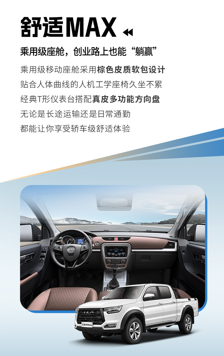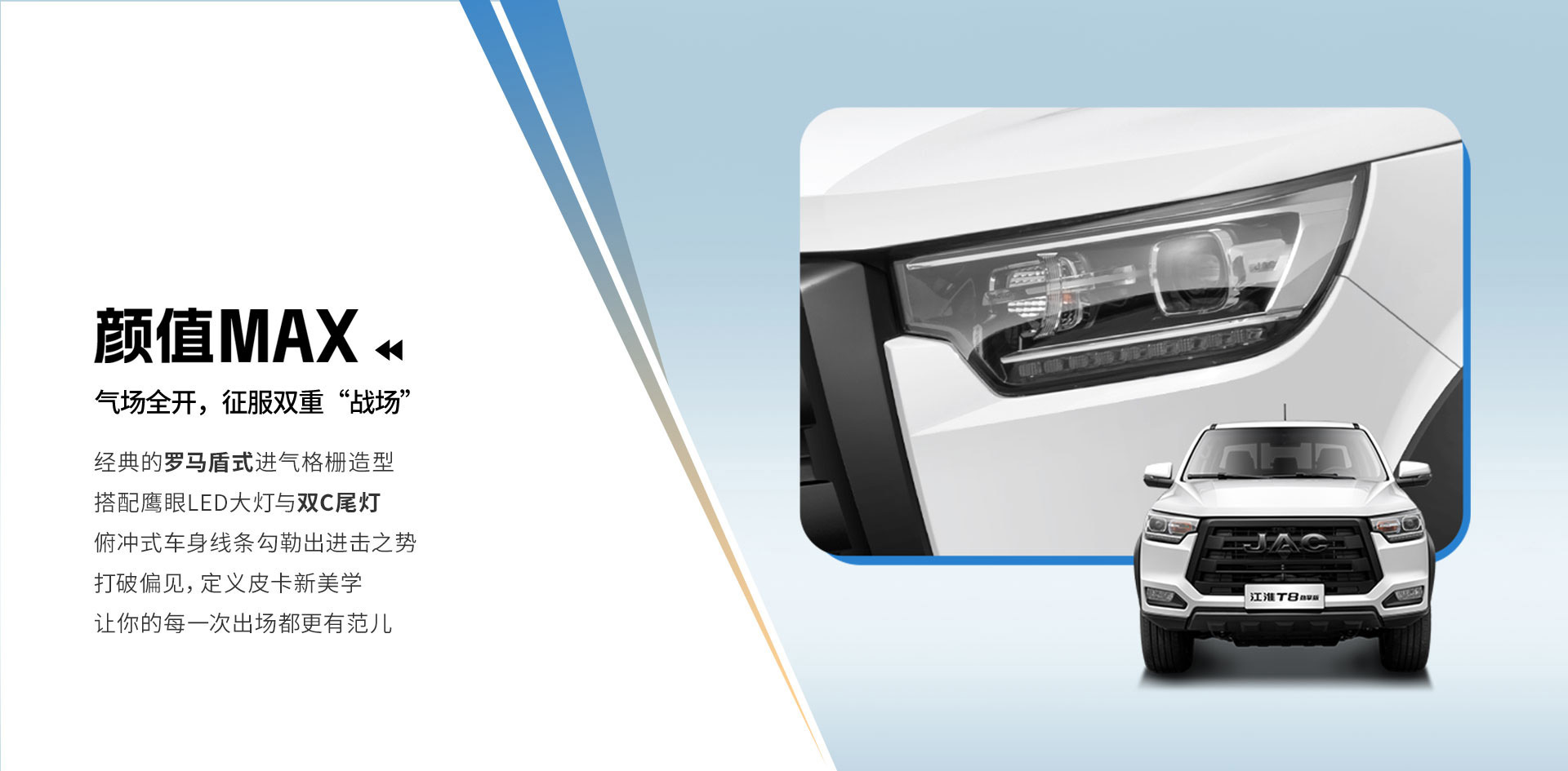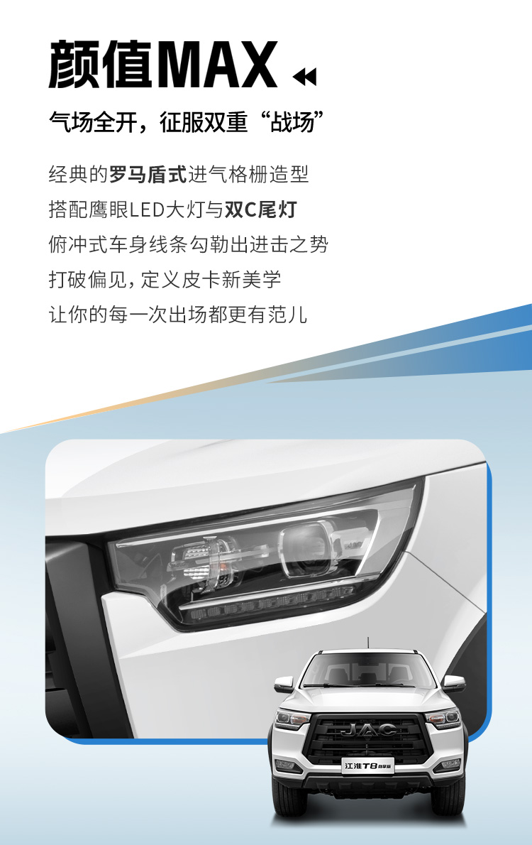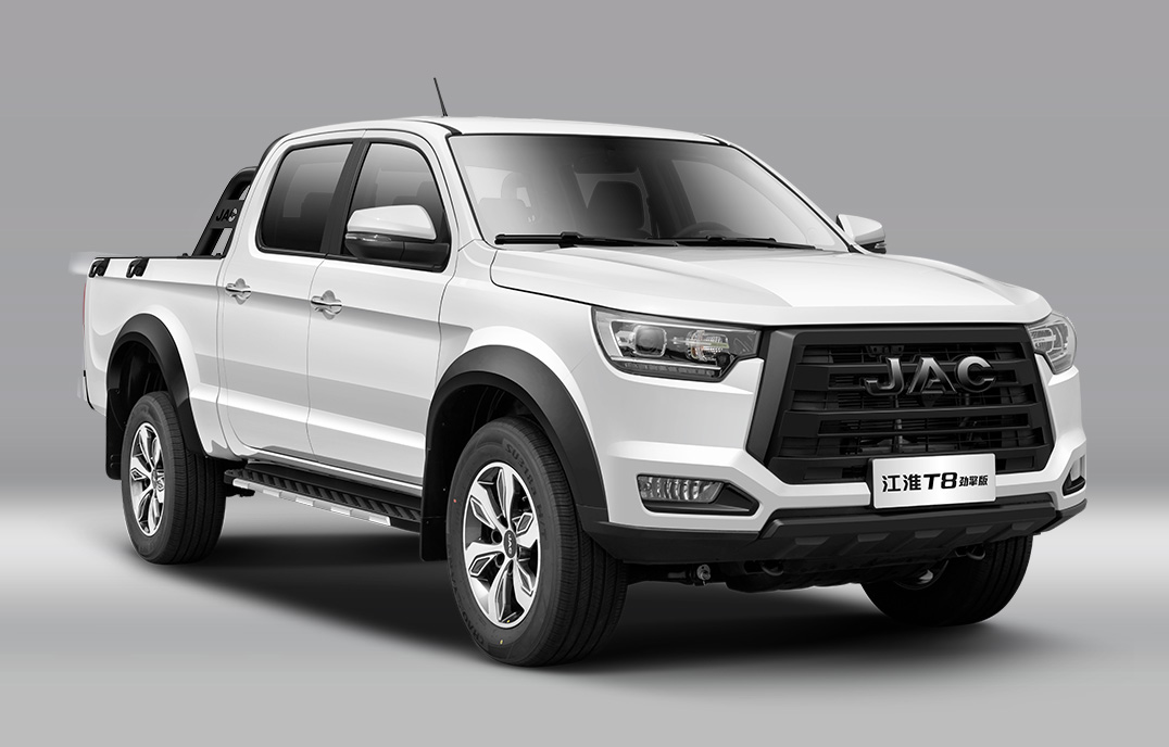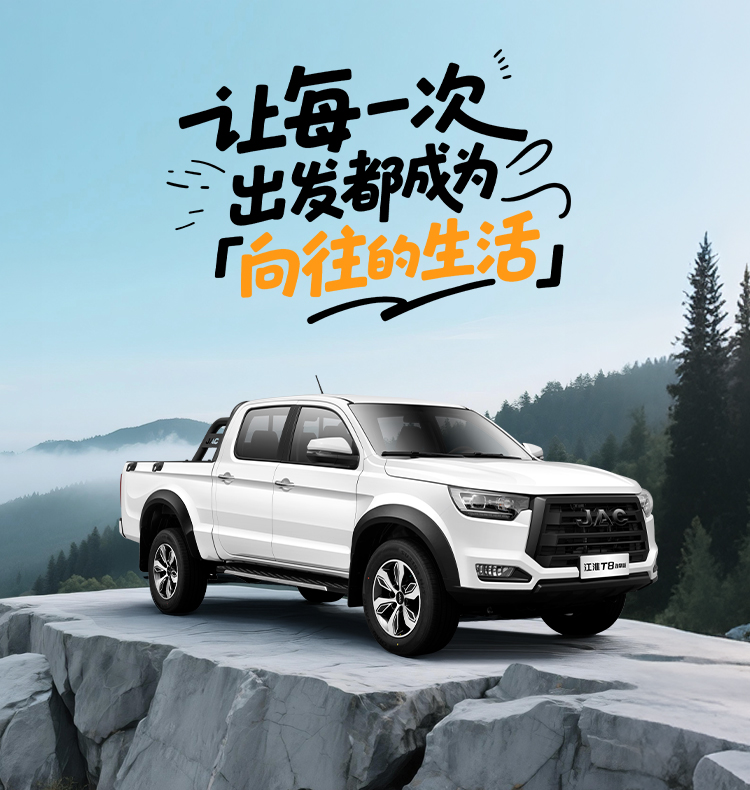 | 备注 | 1、"●"代表标配,"—"代表无此配置,"○"代表选装; 2、可选颜色:极境黑、珠峰白、焰日红、泸沽蓝、流光银、山岩灰、大漠黄; 3、选装平货箱加价2000元;选装后桥机械式差速锁加价3000元;选装“铁质越野版侧踏+铁质越野版后杠"加价1000元;选装越野轮胎; 4、JAC江淮皮卡营销公司保留对以上配置价格修改的权利。 | ||||