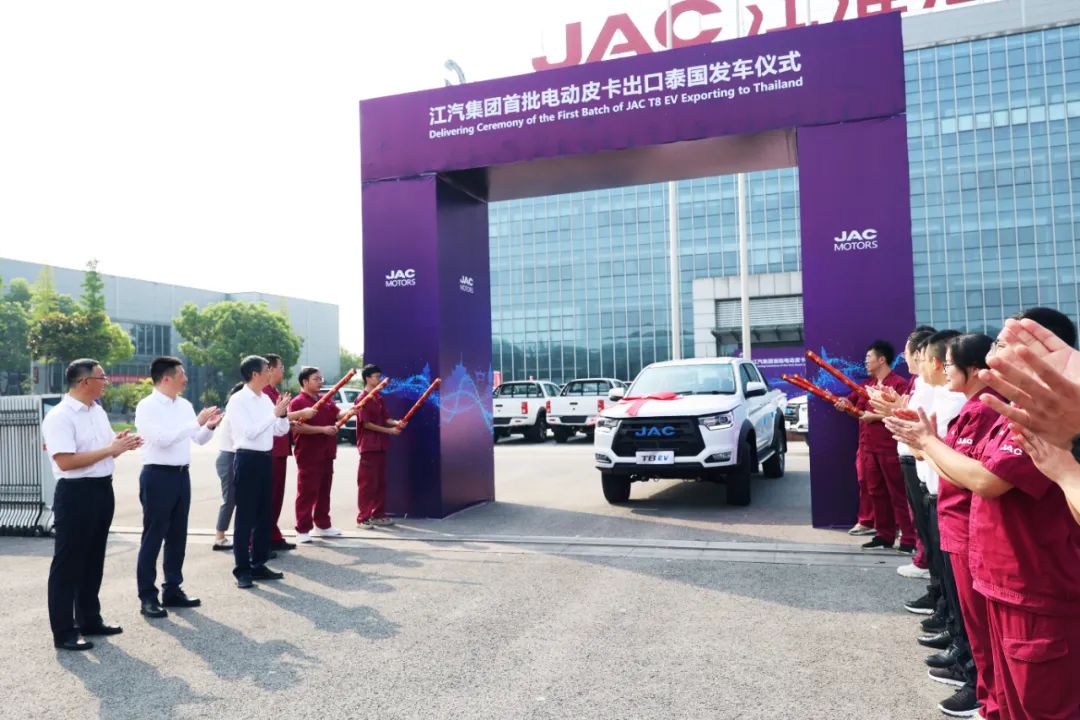 注:江淮汽车举行首批电动皮卡出口泰国发车仪式
